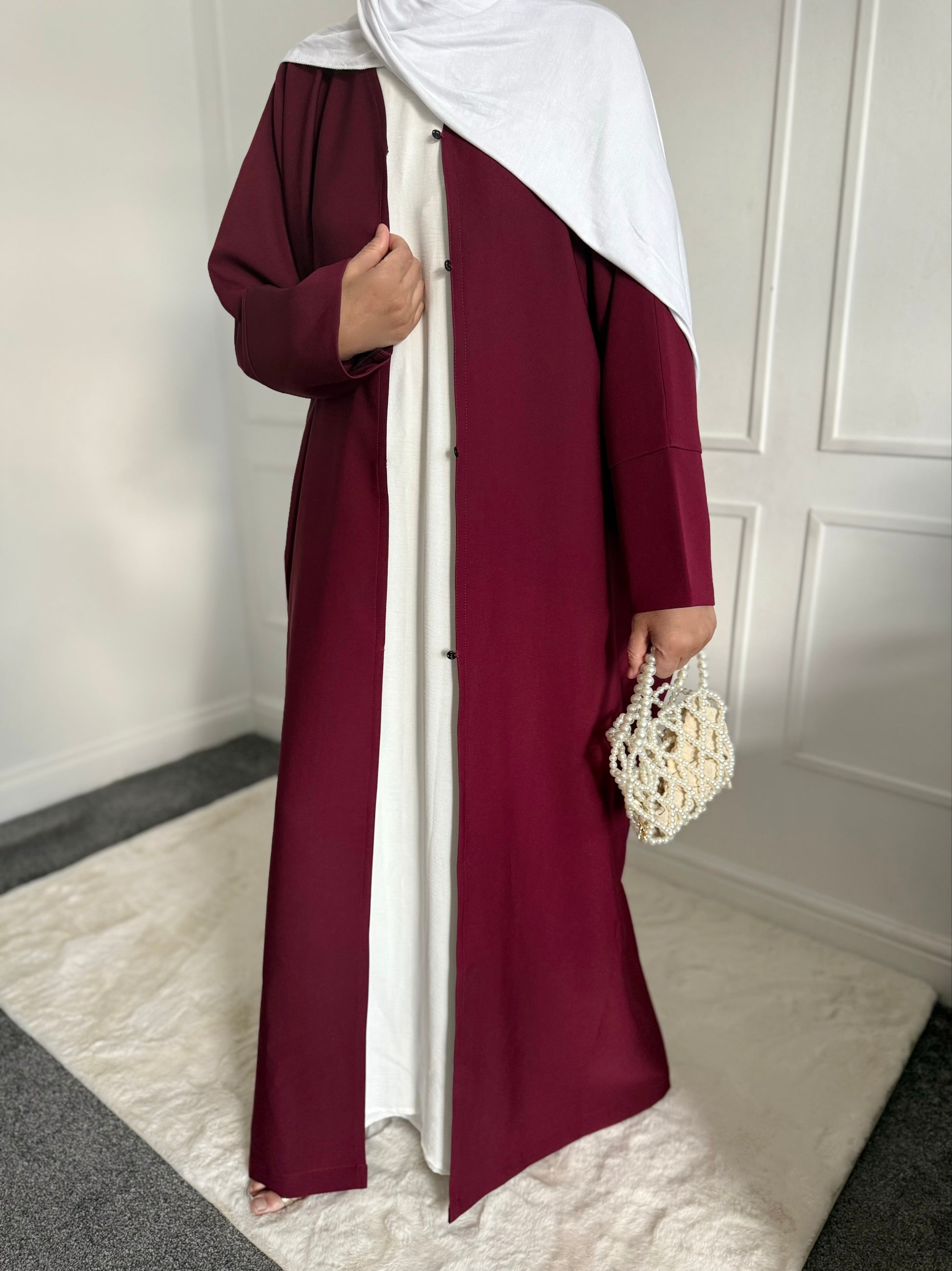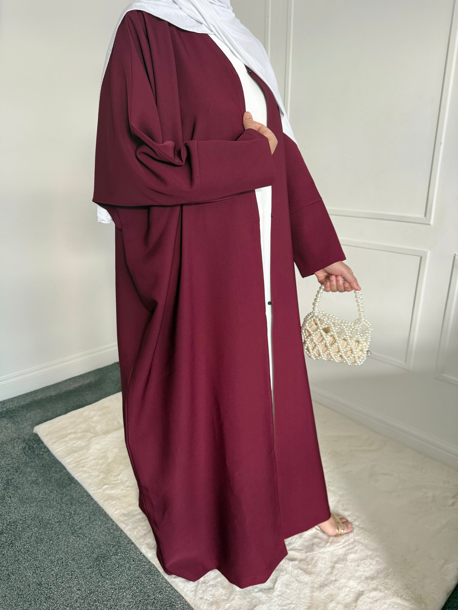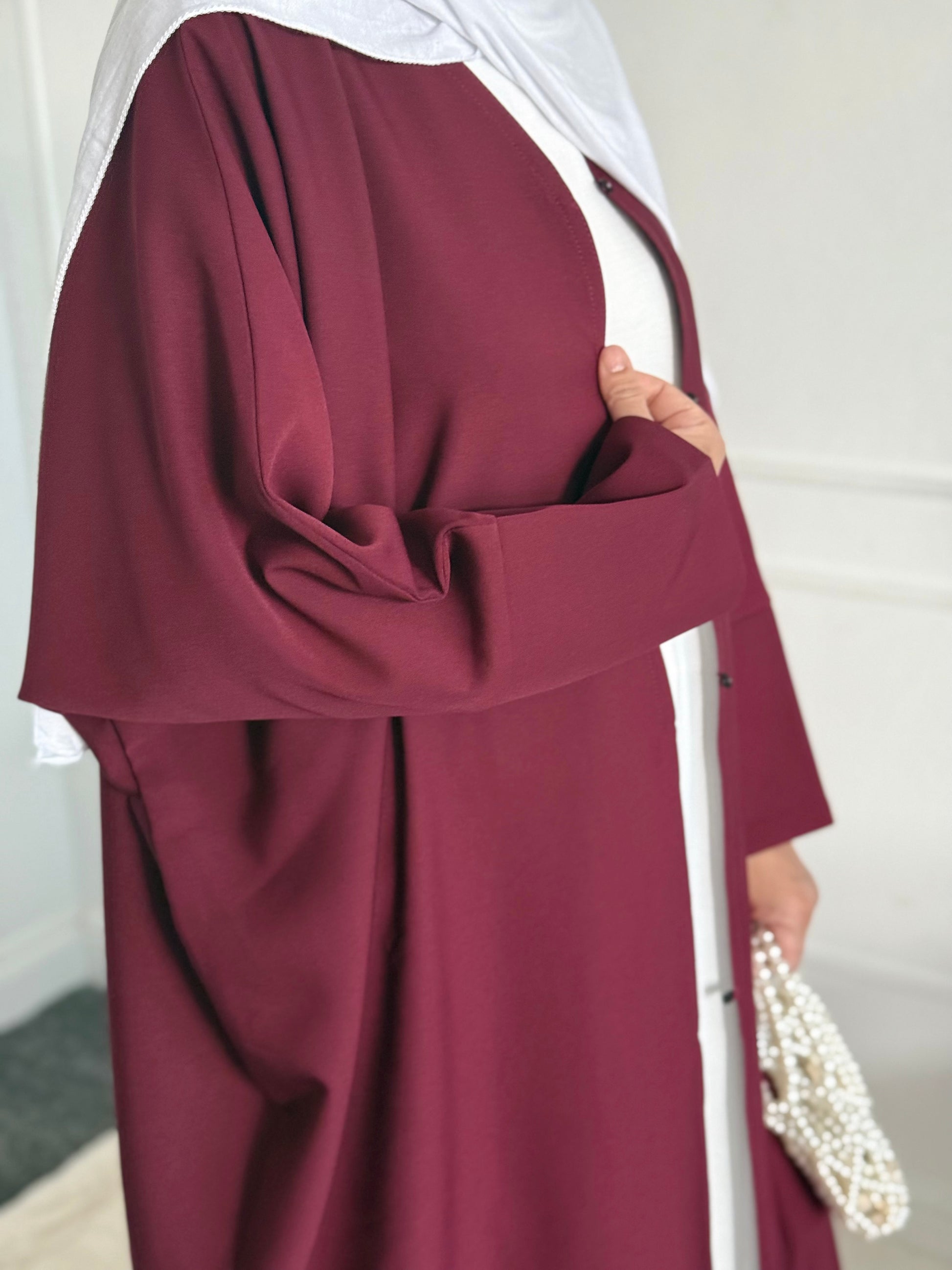 Our pomegranate open abaya is a classic yet elegant batwing styled outer garment designed in a rich, deep red hue inspired by pomegranate - one of the fruits mentioned in the Quran.